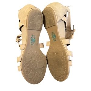 ℹ️Cute tan taupe suede leather like material colored shoes with cutout like designs and a adjustable strap up tie through design. With a zipper on the back of the heel and has a slightly raised hill. With a comfortable thick heel insole. Has some black scuff mark on the back bottom of the shoe along with a small mark on the top front of the shoe. There are some toe indentions (Pictured) reflected in price. Love them? Make an offer! These are a laid-back style and comfort shoe. Perfect for spring, summer, or to wear on vacation or any event with a classy boho chic vibe design.