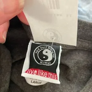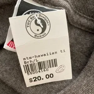 T&C Surf Designs is a popular local Hawaii Brand of clothing. I’m sure someone out there who likes their designs will find this as a little gem. The front of the brown shirt has a local Hawaii pidgin English quote about Hawaiian Time. The back of the shirt bears the T&C logo and one of the sleeves has a Hawaiian flag.