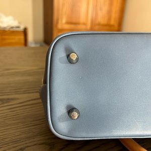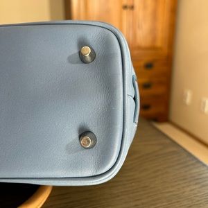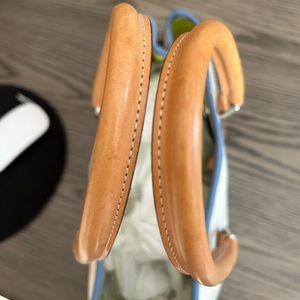 Vintage coach canvas and blue leather bag in great condition. It has a white spot on piping on bottom of bag that there is a close up of. Leather handles have a little fading/water spotting. Snaps at side to expand and center hook with two rings. It has metal feet on bottom and one slip pocket and one zippered pocket inside.