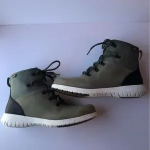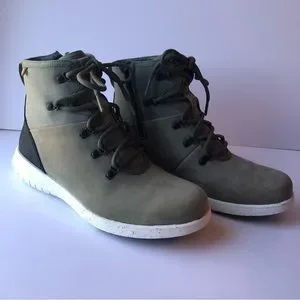 Bogs Loden Olive Green Black Juniper Hiker Women's Casual Boots. Olive green colour with black and white and black/grey speckled outsoles. Great hiker boots to wear around town or out on the trails. Make hiking boots a fashionable look with these hikers to suit your everyday casual needs and your yearning for exploration on your next hiking trail mountain camping adventure. These Women’s Juniper Hiker and Chelsea boots might just be the lightest and most comfortable fashion statement an urban hiker can make. Footbed technology to help to fight odour. 20% recycled outsole materials. 100% Waterproof top to bottom with gold-certified leather upper. EVA footbed. Rebound cushioning in the midsole provides all-day comfort and energy return. Zipper on the medial side for easy on/off entry and exit. Rubber pods on the outsole provide slip resistance. Resist slipping BioGrip outsole. High abrasion heel overlay for better durability. Sweat-wicking technology moves sweat away to keep your feet dry.