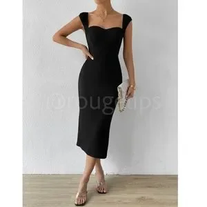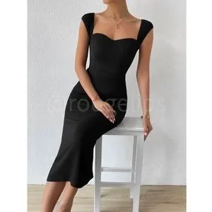 Sweetheart Neckline Decollete Black Pencil Dress Lace Up Back Slit Midi