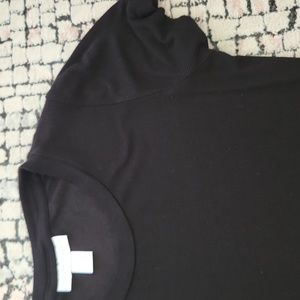 black, ribbed, no side rouching, capped sleeves, hits at mid calf, jersey material, minimal wear (pregnant in ND winter) very comfy and flattering