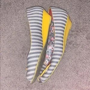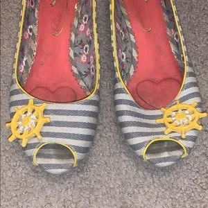 These nautical cuties came from Modcloth by Irregular Choice. I understand they were also carried by Anthropologie. These peep toe wedges are perfect for summer! In good used condition, just trying to make some space in my closet 💕 Please see photos for wear- these have been worn and the light fabric does show wear. Please note that these are not brand new before purchasing.