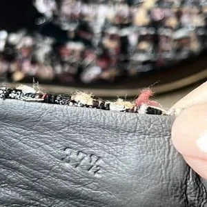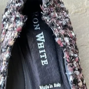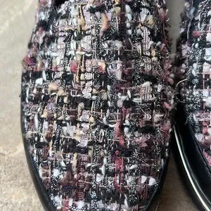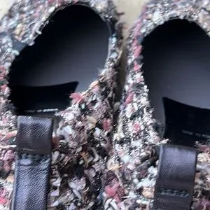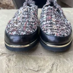 Tweed, boucle and Napa uppers with gold trim along the slight 1” wedge sole