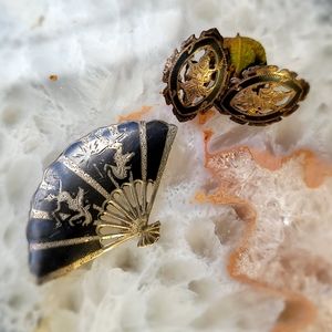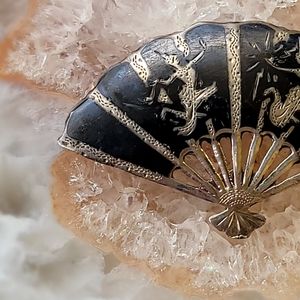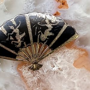 A fan-shaped brooch depicts a scene of two goddesses from the Sanskrit epic Ramayana (also known as Ramakien), one of two important allegorical tales in the Hindu religion. There is some wear, and the pin in the back is a bit loose. It can be reinforced if you get crafty with it. A great collector piece.