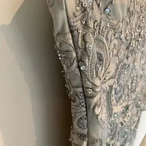 Has the dress been altered or is it a true size 8? Would you explain further the difference in color between the mfg pictures ( which I LOVE) versus your photos which show the gown as brownish or rust-ish. Any more photos showing true color. I’m very interested in a silver gown. Thank you.