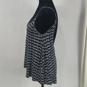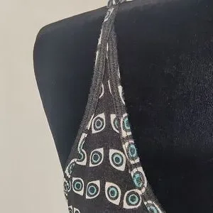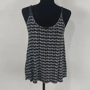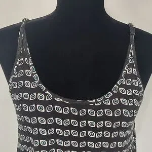 Lauren Moshi Eye Patterned Tank. Adjustable straps. Scoop back. In good pre-owned condition with some fluffing on the material, typical of this type of fabric. Size medium. Lying flat the length is approximately 17 1/4 inches when measured in the center from the bottom of the scoop neck to the hem. It is approximately 15 1/2 inches pit to pit.