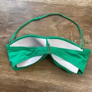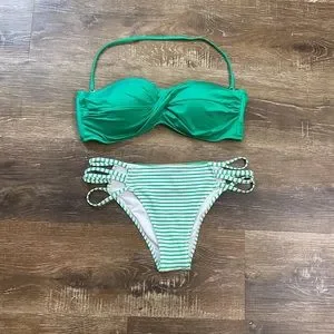 Top is solid green and bottoms are green and white striped top has removable strap and is padded bottoms have 4 strings on sides bottoms are CUPSHE size small top is Mossimo size medium good condition