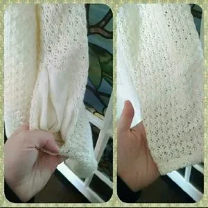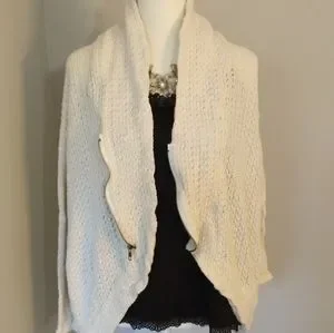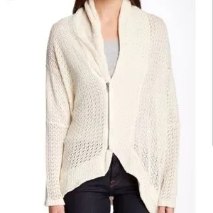 Beautiful cardigan, used for window display. Unworn and put in storage. This is a nice breathable side zip cardigan you can wear over anything with little pockets. Collar is double lined. Longer in the back than front. Zip is off to the side. Pockets. Nice collar to protect your neck! Very soft fabric.