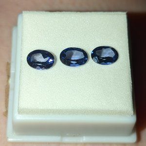 These are treated topaz in a dark blue and my late Mother's handwritten note says it's "treated tanzanite". Assuming that it's meant to look like a color treated topaz that rivals tanzanite but at a much cheaper price. Three gorgeous large faceted treated blue topaz to make your very own custom jewelry design or commission one from someone else.