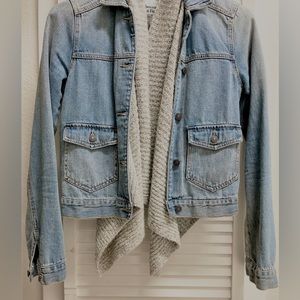 Abercrombie & Fitch Jean Jacket Faux gray knit scarf attached, Excellent condition, light blue button down, fitted, button at sleeve cuffs, washed denim, two front pockets.