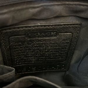 Black coach bag with blue stitching. About 12 inches wide and 8 inches high