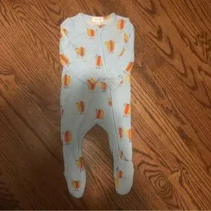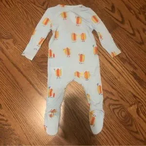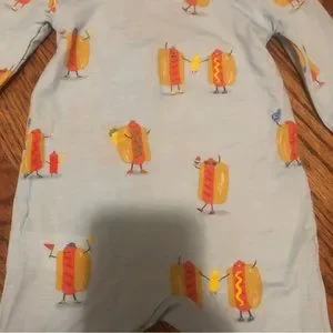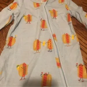 This adorbs footie pajamas from Angel Dear is brand new with tags. Has a light blue background with a hot dogs enjoying summer print. Features foldover mittens, chin protector, and double zipper. Made from super soft and stretchy bamboo. Too cute for your summer babe!