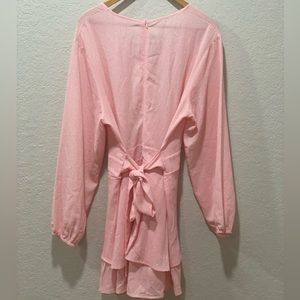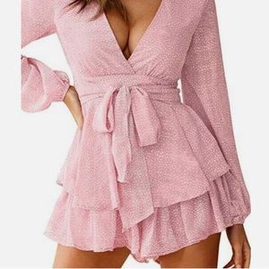 Women's Long Sleeve Pink Polka Dot Romper V-Neck Jumpsuit Tie & Ruffles XXL