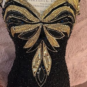 BLACK TIE black & gold beaded formal gown vintage women’s dress zipper back 8