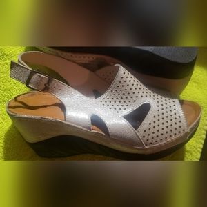 Brand new, never worn, Anna Viotti women sandals, leather upper, very nice soft metallic cream color. Confortable, heel height about 3 inches. Size 6 US, (37 EU)