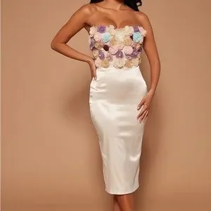 3d Flower appliqués rosette detail strapless satin dress formal midi dress