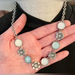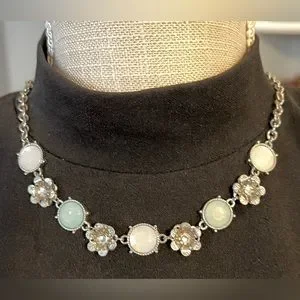 Vintage Opalescent White & Mint Green/Blue Gemstones w/Metal Flower Necklace