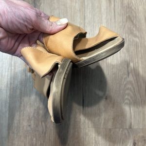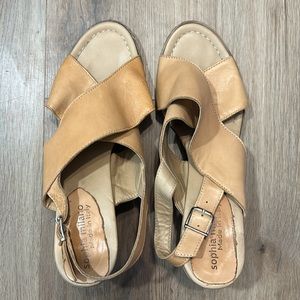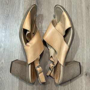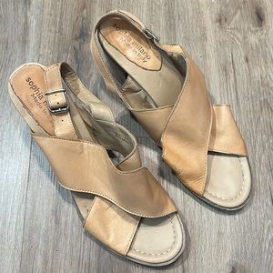 Sophia Milano Camel tan nude leather block open toe heels with adjustable strap