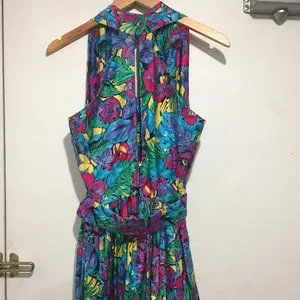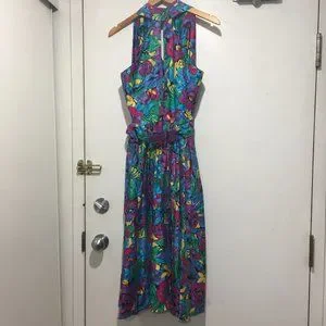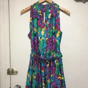 Suttles & Seawinds Multicolor Midi Dress, Lightweight Swing Dress Size M, Multicolor Floral Print, 100% Cotton, Side Pockets, Belted, Sleeveless, V Neck, and Back Keyhole Swing Dress, Closure Zipper and Button, in Good Condition, Made in Canada, Beautiful Summer Dress, Great Look, Great Fitting.