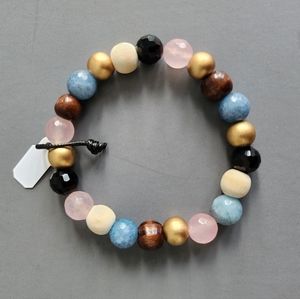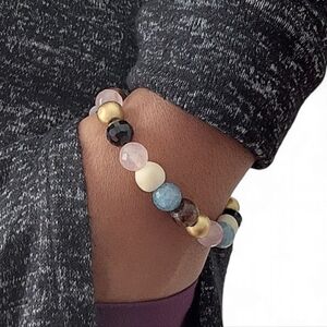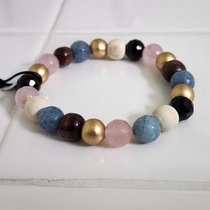 Beautiful 10mm stretch beaded bracelet made with, faceted light blue and rose dyed Quartz, faceted Lucite, and Wood Beads.