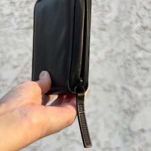 Buffed leather wallet in black. Logo embossed leather zip pull tab. Zip closure. Four card slots, four note slots, and one button-fastening coin compartment at interior. Tonal grained leather lining. Gunmetal-black tonal hardware.