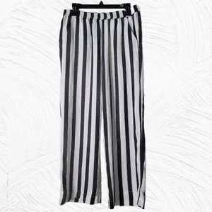 So freaking comfortable! Dark blue/dark grey and white stripes loungewear with pockets. It's not fully sheer but you might want to wear shorty shorts under it.
