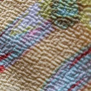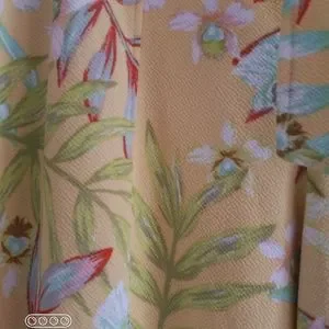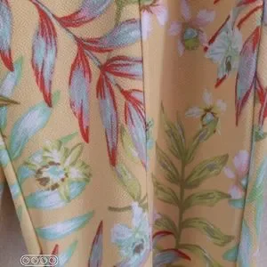 With a background in a wonderful yellow, there are a variety of flowers and palm leaves all over.