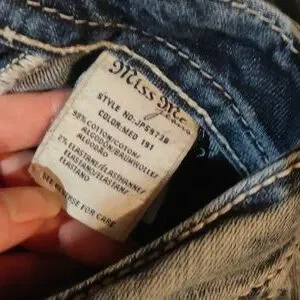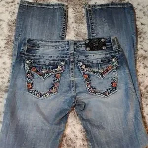 Beautiful floral embroidery on back pockets with rhinestone embellishments with shades of purple, turquoise and orange! Button flap pockets! Turquoise accent stitching on belt loops! No rips, stains or tears! No missing stones!