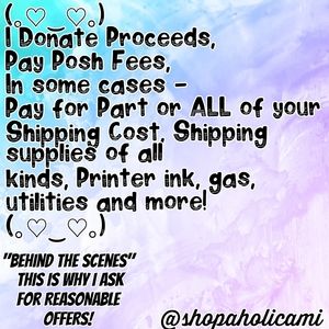 ❤️❤️ I Donate Proceeds, Pay Posh Fees, May Pay ALL or some of your shipping fees, Shipping supplies of all kinds, Printer ink, gas and utilities.