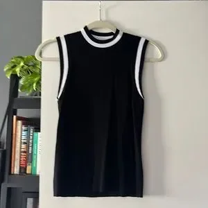 Sleeveless rib knit viscose-blend tank top in shiny black. Rib knit crewneck collar and armscyes striped in black and white