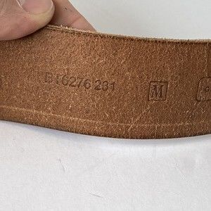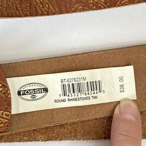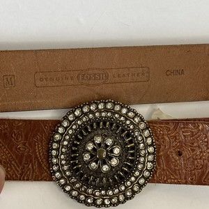 Fossil Womens Brown Gold Leather Tooled Belt Brass Floral Medallion Buckle size Medium Fits a 32-35" waist Good pre-owned condition. See photos for wear.