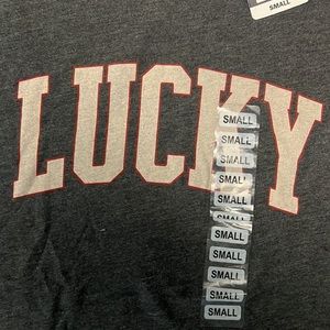 Men’s dark gray Lucky Brand short sleeve T-shirt with front graphic print design. Made of 50% polyester, 38% cotton and 12% rayon. New with tags and ships from a pet friendly smoke-free home.
