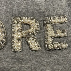 Worn only once, this light weight, 80% cotton, banded sweatshirt has the word and Maurya across the front. The letters are embellished with pearls, beads,and rhinestones.