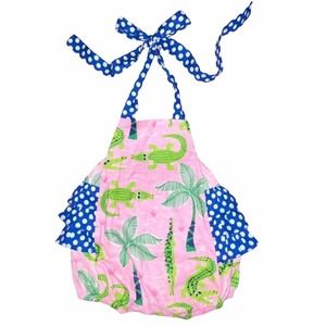 6/9 Ricrac & Ruffles Baby Girls Boutique Pink Green Alligator Bubble Romper
