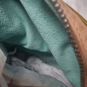 Outside color is a dusty mauve/peach/pinkish tan color. May vary slightly from photos. The material is leather. Entire inside is turquoise suede(?) fabric as well as the inside of all the pockets. Green accents on the seams of the handles and pockets as shown in the pictures.