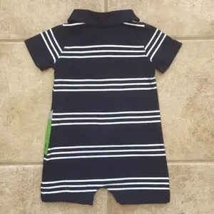 Short sleeve navy blue polo style Romper or jumper with narrow white stripes featuring large green and gray dinosaur appliqué