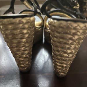 Brand new Coach Sandal , is gorgeous, black leather with Gold insole, and heel, Braided golden leather heel