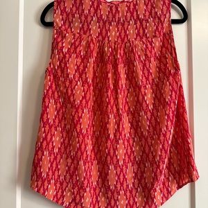 This Joie tank is beautiful for summer. The print is a a red/pink/peach Aztec. V-neck with buttons in the front. Perfect with white or true denim jeans or shorts with cute sandals. Worn once.