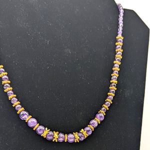 Vintage Amethyst necklace features graduated sized beads in various shades of purple separated by gold-tone spacers.