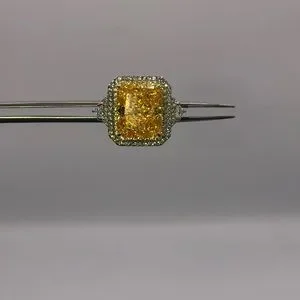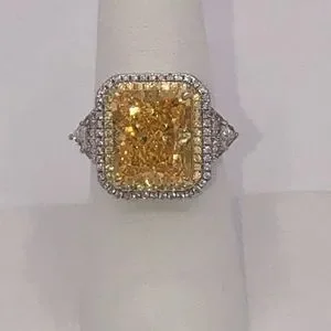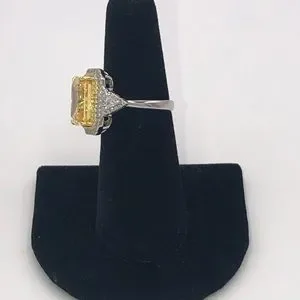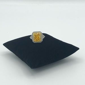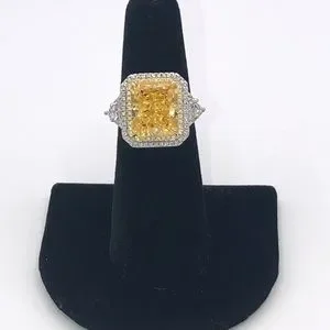 The center stone is made of an 8 carat fancy canary diamond simulant secured in an 18k yellow gold claw setting