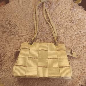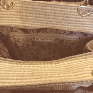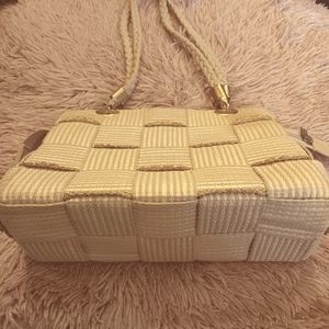 Midcentury vintage, circa 1960. Made in Italy. Off white woven knit tote bag with metallic gold(tone) threading. Top zipper. Braided shoulder straps are knotted for the photo