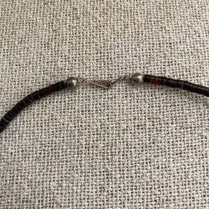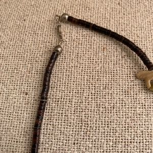Very cool Native American fetish necklace. At the very bottom of the necklace is the Sun Face. Also depicted on the necklace at bear, fish, coyote, hummingbird and turtle. Necklace measures approximately 12 inches from the clasp to the Sun Face at the bottom of the necklace. Silver hook clasp is connected to the fetish by brown beads.