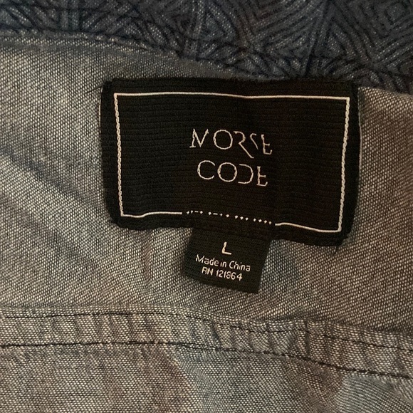 Blue On Blue Geometric Design Button-Up Shirt by Morse Code. Size large. 100% cotton. Washed prior to listing.