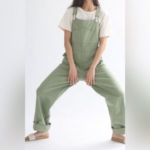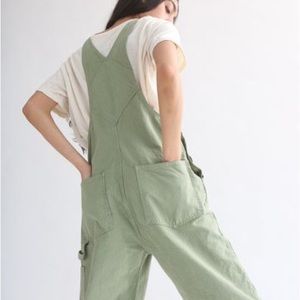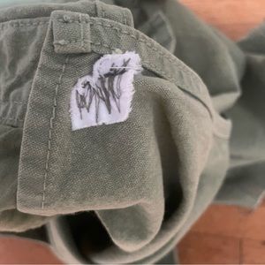 First owner reinforced one side button from the back, but it cannot be seen when worn. Size M. Waist 16.5, hip 19”, top of bib to crotch 24”, shoulder straps adjustable, inseam 26”. Comes with a raw hem that you can cut to fit or wear cuffed.