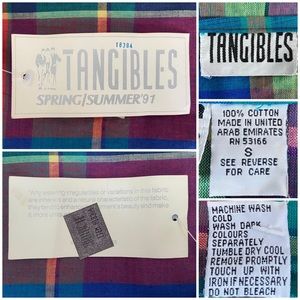 - Details: multicolor, madras plaid, collared V-neckline, sleeveless, front button closure, drop waist, shirred center back, subtly pleated, side pockets, straight hem, unlined.