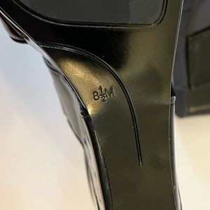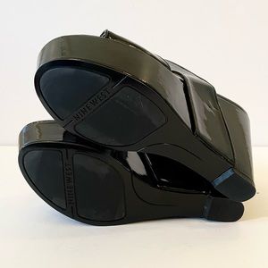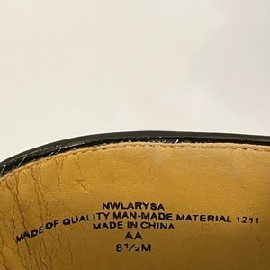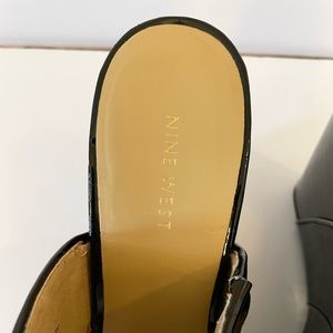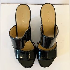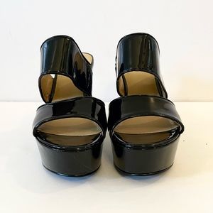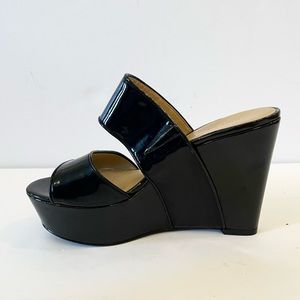 Nine West Patent Platform Wedge. 100% man made materials. Size 8 1/2. Pre owned in Good condition. Scrap on back of one heel and wear on inside upper strap. See photos for details