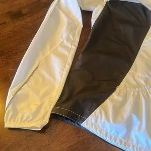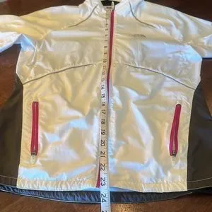 The North Face Jacket. Size Small. Flight series. White black and fuchsia trim, reflective trim, two zip front pockets, one small zip pocket at the back, one “pouch” pocket at back, back venting at shoulders, and drawing string at waist . Some staining at