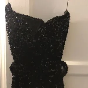 Shein size small strapless black sequin dress! Half open back. Loved this dress! I got so many compliments - I only wore it once to a wedding. Length was altered for my height 5’’4’ with 2-3 inch heels