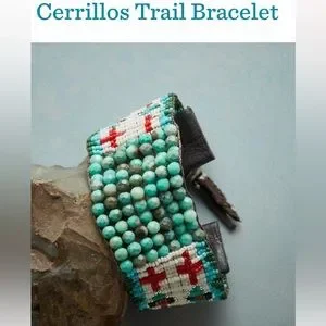 NNW Sundance Cerrillos Trail Bracelet with faceted chrysoprase and seed beads commemorates the historic mining trail between Santa Fe and Albuquerque. Adjustable leather closure. Bracelet is a handmade exclusive created by Naomi Herndon, 6”- 7-1/2” in length. NO OFFERS.